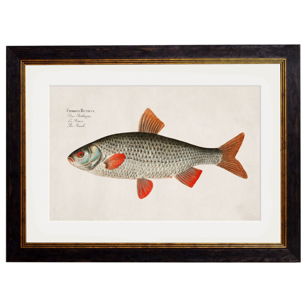 Transport your space to the later part of the 18th century with this delightful collection, reviving original French natural history illustrations. These exquisite illustrations depict four different freshwater fish species with meticulous detail, adding a touch of historical charm and natural beauty to your decor. Prints of this style were originally printed in black and white and then hand-painted over the top to give them bright vibrant colours.