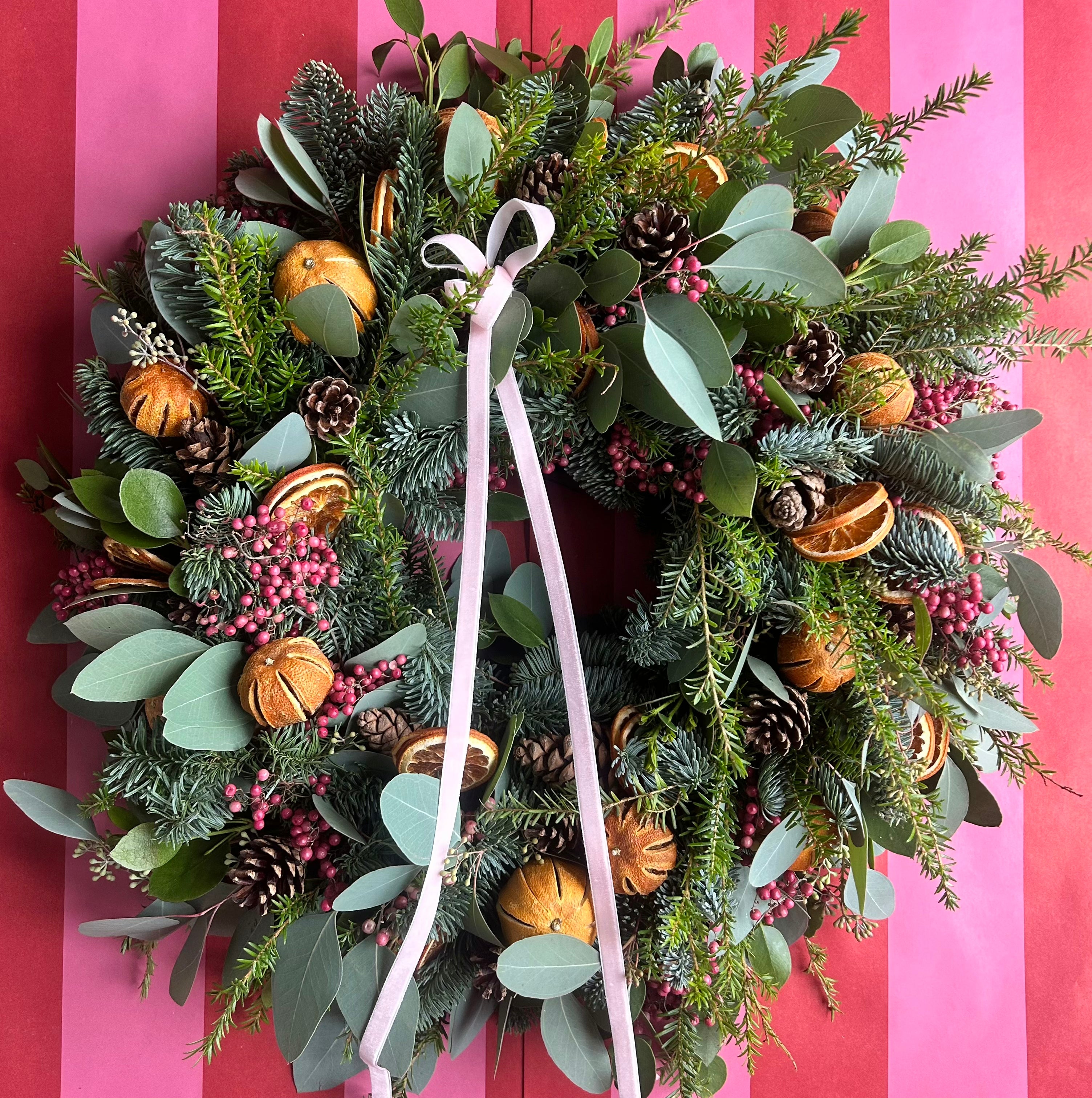 Lovingly handmade, this wreath is made on a sustainable moss base and features a rich mix of spruce, eucalyptus, and hemlock spruce, creating a full and fragrant winter design. Nestled among the greenery are clusters of pink pepperberries, natural pine cones, and dried oranges, all finished with a luxury thin pink velvet ribbon for a modern, romantic twist on the classic Christmas wreath. Perfect for bringing subtle colour and natural texture to your front door, the Pink Pepperberry Wreath captures the beauty of the season with an elegant, sustainable touch.