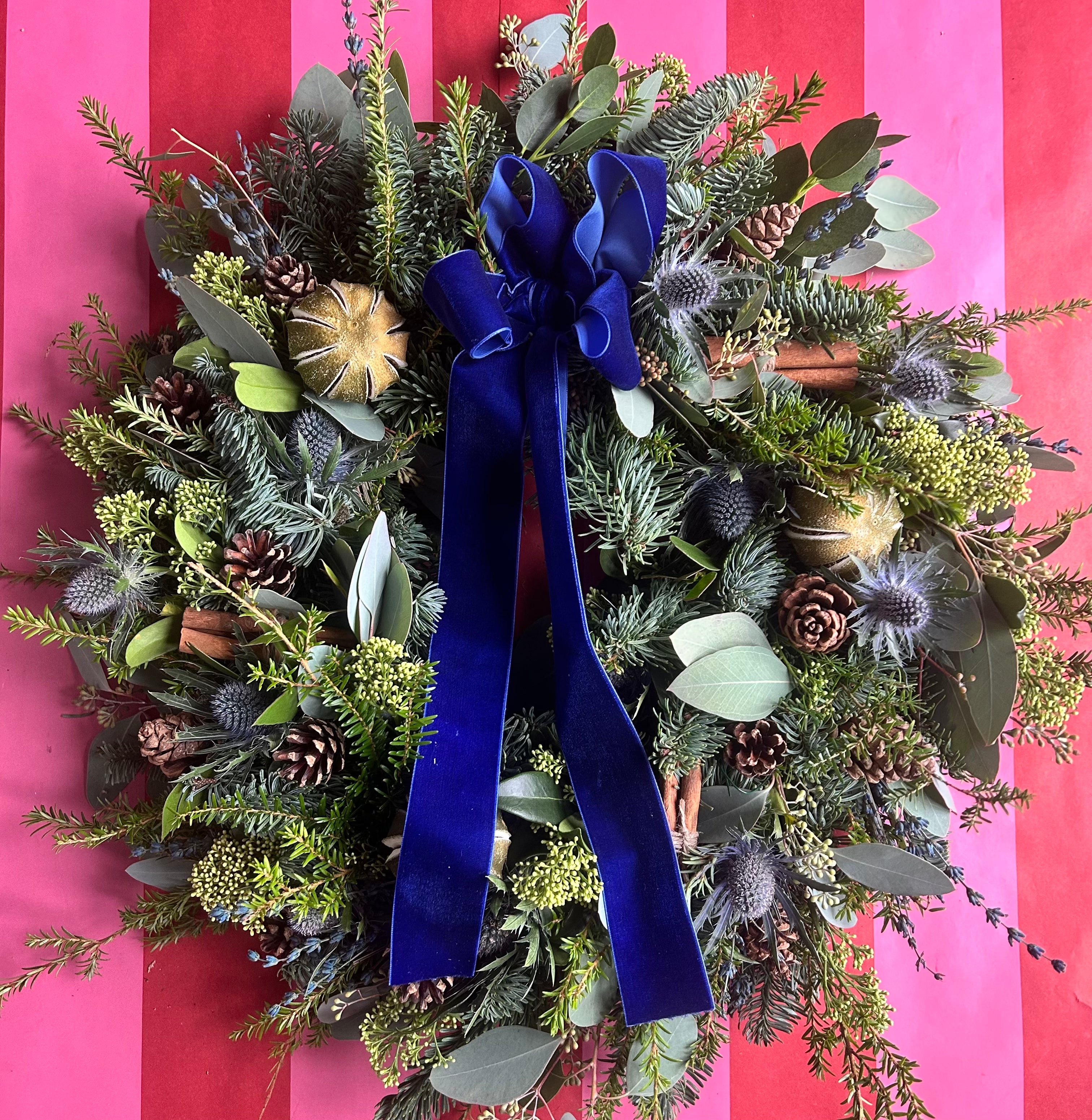 Embrace the magic of the season with our Blue Noel Christmas Wreath — a beautifully handcrafted Christmas design that blends timeless tradition with a touch of wintry elegance. Each wreath is lovingly made on a sustainable moss base, lush with fragrant spruce and eucalyptus, and adorned with a charming mix of blue thistle, lavender sprigs, pine cones, dried limes, and cinnamon sticks for a naturally festive aroma. The design is finished with a sumptuous blue velvet bow, adding a cool, contemporary twist to a classic Christmas palette.