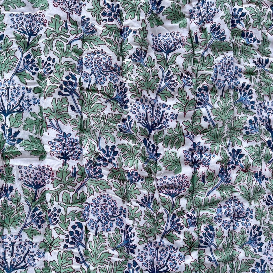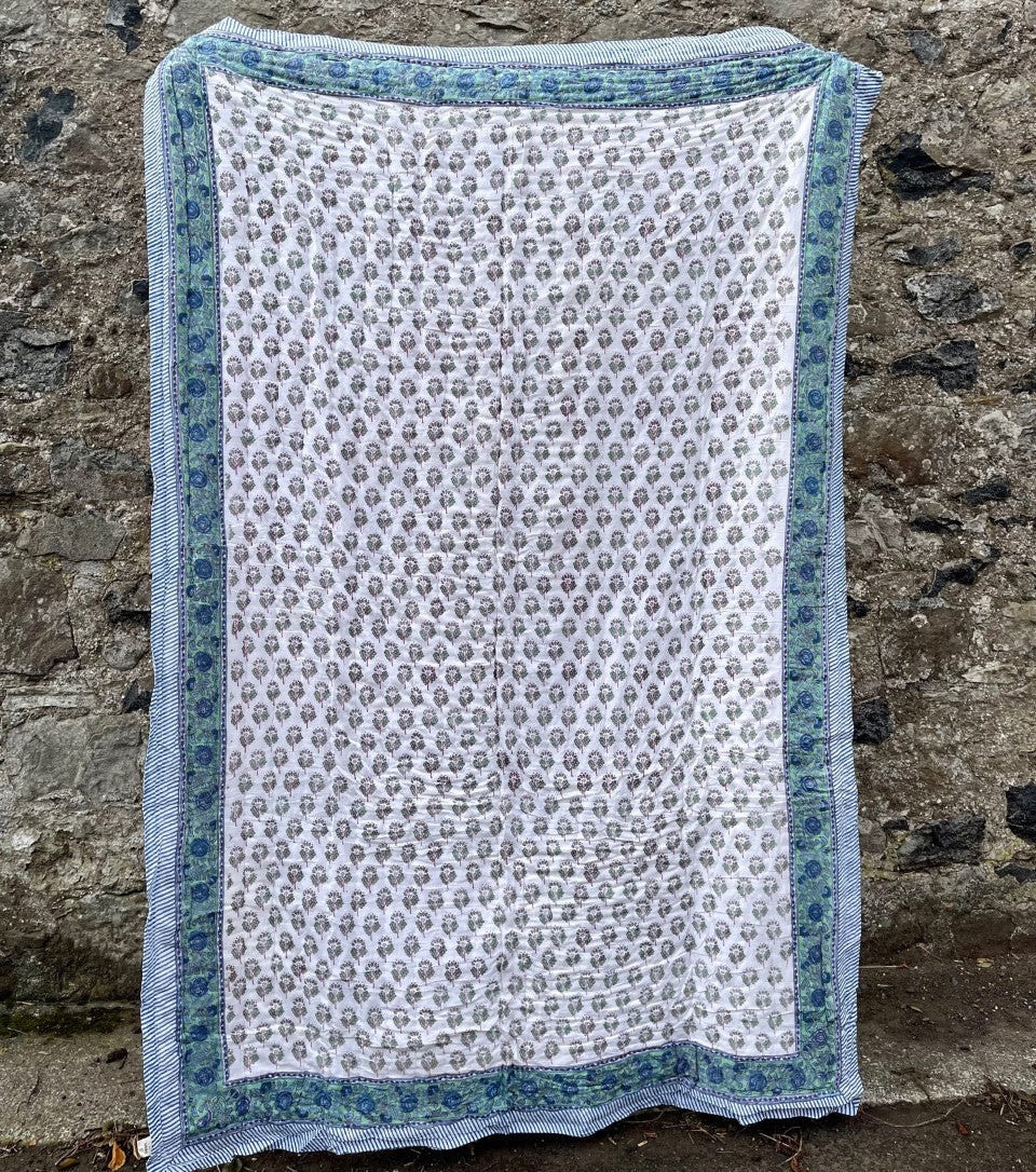 Available in single, double, and kingsize options, this quilt is crafted from 100% cotton throughout, including the internal wadding. It's handblock printed in India, showcasing the craftsmanship of traditional techniques. Maintenance is a breeze as it's machine washable on a cold cycle, and you can tumble dry it on low heat to fluff up the filling. With each wash, these quilts become softer and more inviting, making them a perfect addition to your bedding collection for both style and comfort.