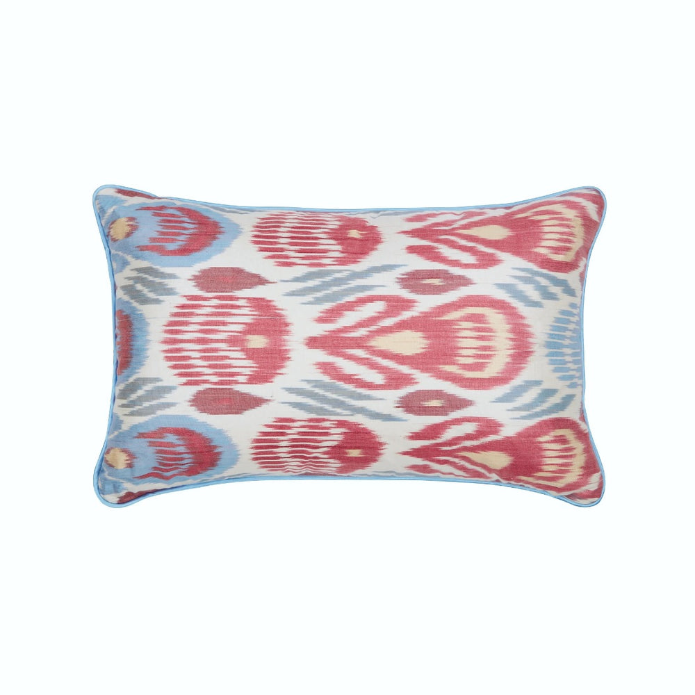 Luxury Silk Rectangular Grey, Red & Blue Ikat Cushion