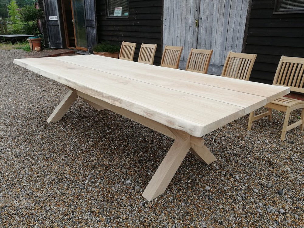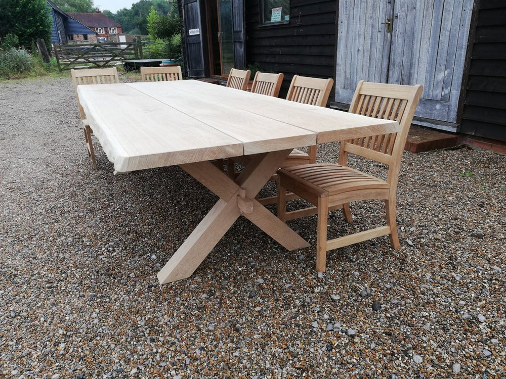 Elevate your outdoor dining experience with our timeless cross leg tables, meticulously crafted from solid oak air-dried timber. These tables feature a sturdy top comprised of three wide planks, each with a thickness of 50 mm. To accommodate the natural movement of the oak, there is a small gap between each plank.