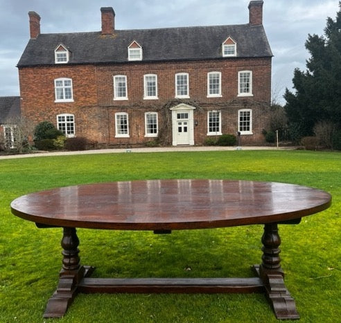 Stunning solid oak oval refectory table with a beautifully crafted planked top, designed to seat 10 comfortably. The tabletop has been meticulously restored and French polished, bringing it back to its original splendour. This exceptional table is in perfect condition, combining timeless elegance with durability, making it a striking centrepiece for any dining space.