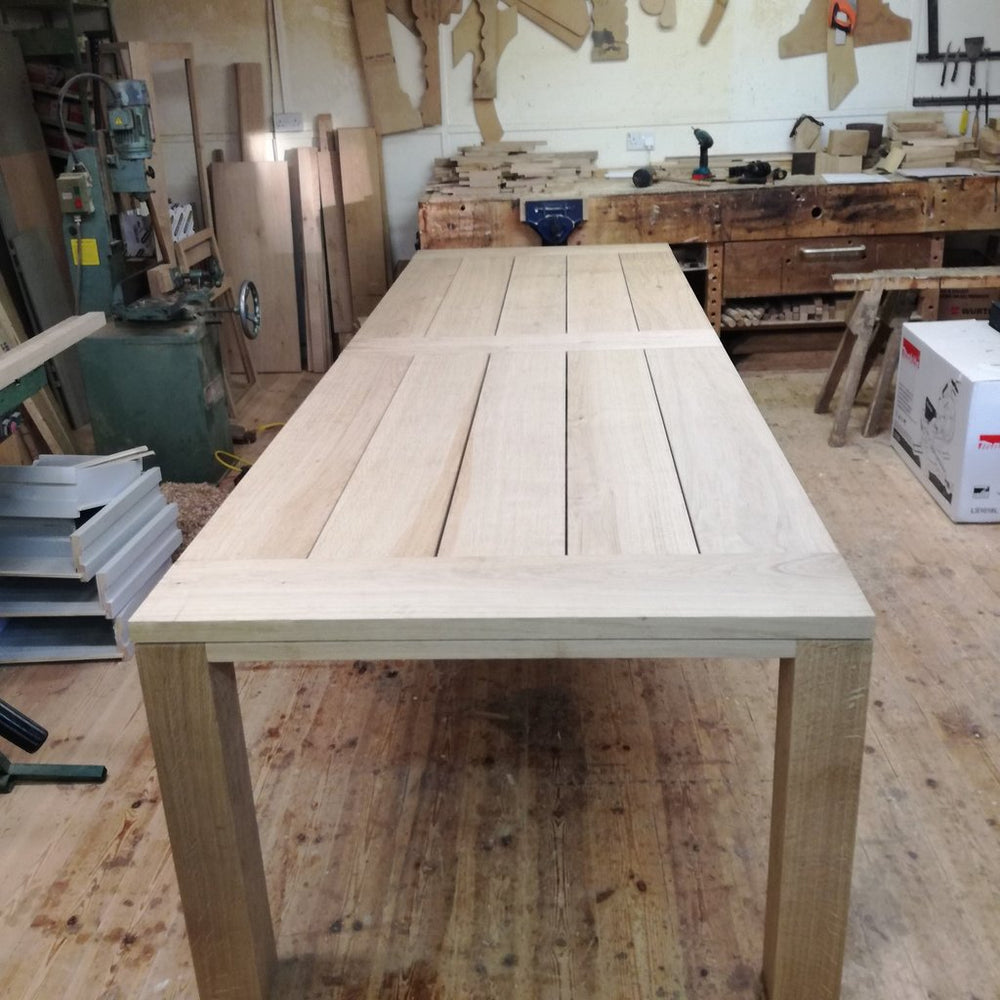The table's top consists of five wide planks, each with a substantial thickness of 50 mm. It features breadboard ends and a central crossbeam, adding to its visual appeal and structural integrity. To accommodate the natural movement of the oak, there is a small gap between each plank.