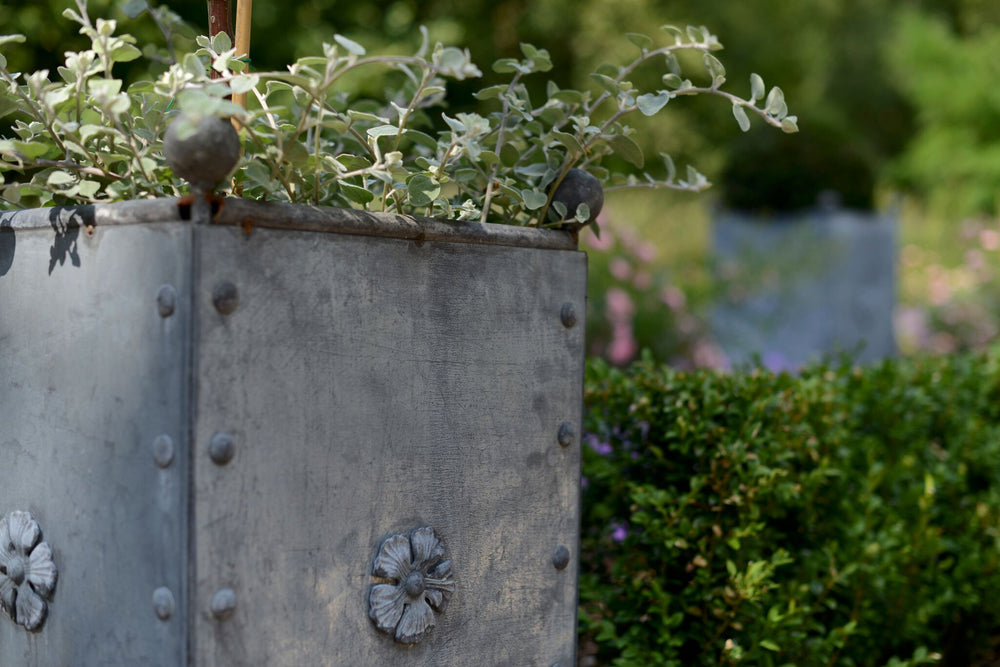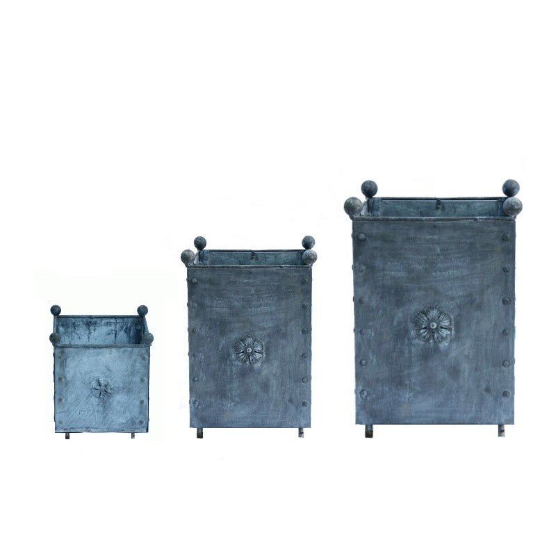 Forged from a 1.5mm galvanised steel, then beautifully finished with treatment to produce an aged patina. The bottom panels are drilled to allow free drainage, and there are special 6cm feet in each corner to keep the base clear. All the ornamentation is galvanised separately, and they also include galvanised coach bolts to hold them together. The decorative balls and Tudor roses, as well as the legs, are galvanised cast iron.