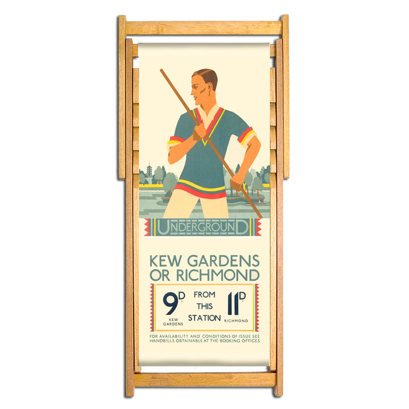Revive the allure of yesteryears in your outdoor retreat with our exceptional Vintage Inspired Wooden Deckchairs. This deckchair is part of the Kate M Burrell collection; consisting of seven designs from the TFL's London Transport Museum poster archive. Drawn between 1927-1928 they take the sitter on an art deco adventure from the end of the line, to an up-river excursion via Kew Gardens, a countryside jaunt and finally a visit to the Southend seaside across a palette of bright pinks, blues and greens. Burrell designed posters for the Underground Group and London Transport between 1924-1934. A relative mystery though surrounds the designer who is thought to be Kathleen Burrell a founder, in the 1920s, of Clement Dane Studio, which was a prevalent commercial design company at the time. Crafted to embody the grace and charm of bygone eras, this deckchair seamlessly blends classic aesthetics with contemporary comfort. Whether you're soaking up the sun or enjoying a leisurely read, this deckchair promises both style and relaxation.